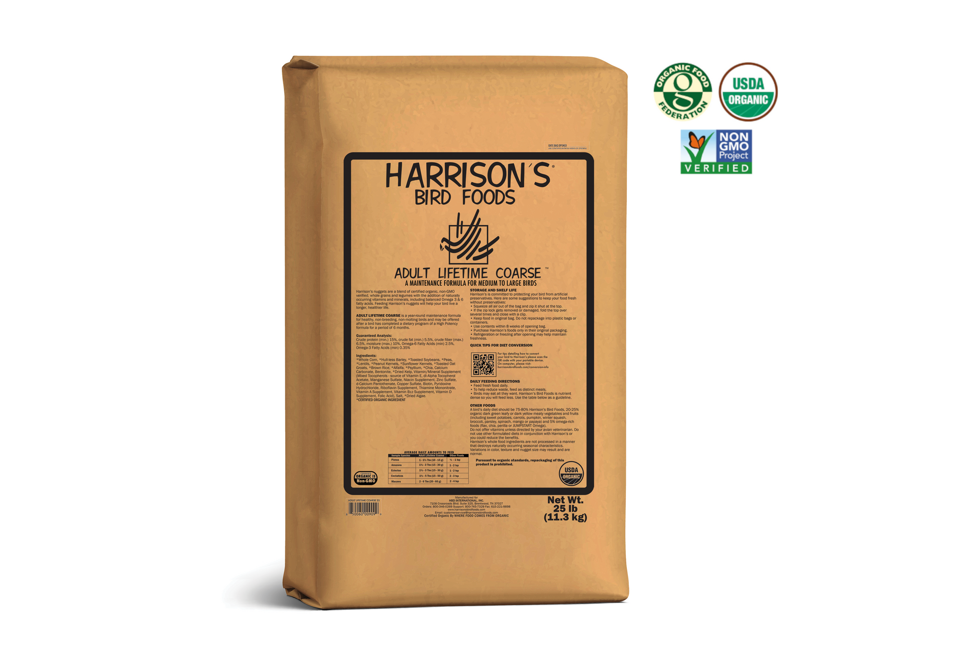 Part of the Harrison's range of complete, certified organic, foods for pet birds, Adult Lifetime diets are a year round maintenance formula for most birds (some species and birds with special requirements should be fed a High Potency diet). The Coarse size of piece is usually preferred by larger birds, such as African Greys and Amazons.