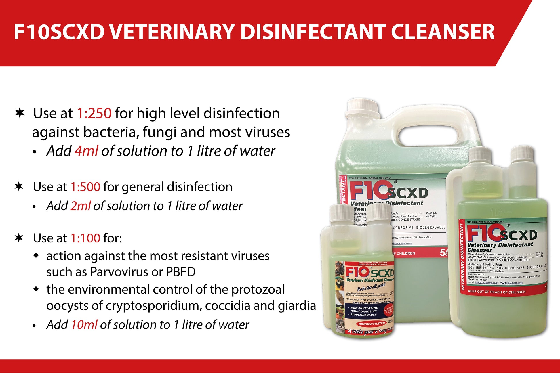 - Due to the cleaning detergent contained in F10®SCXD, any food bowls or instruments that are to come in close contact with animals should be washed with clean water to ensure no soap residue is left.